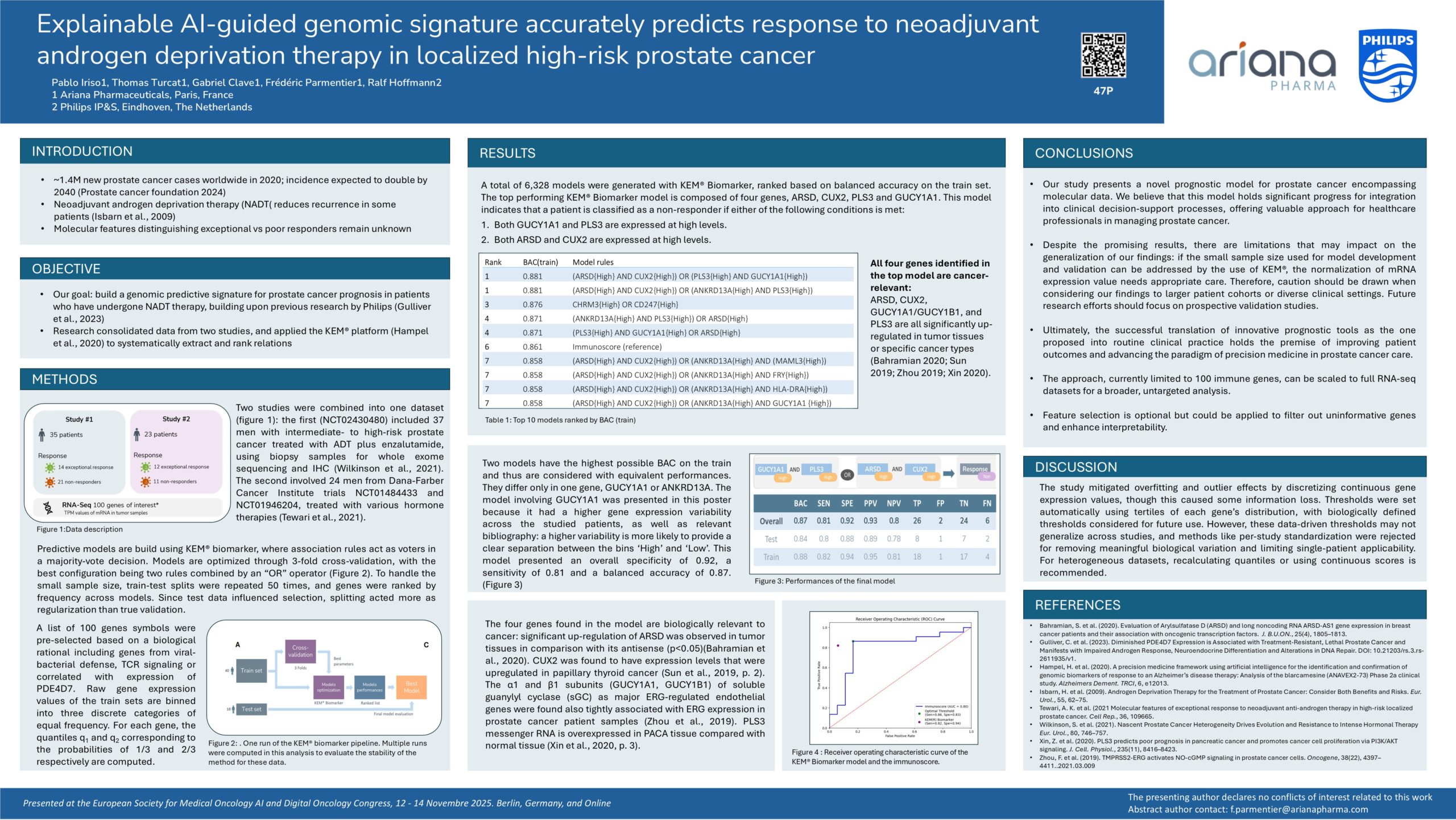 To address this need, Ariana Pharmaceuticals, in collaboration with Philips, conducted an Explainable AI–driven study to identify genomic features predictive of NADT response. The results were presented as a scientific poster at ESMO-AI 2025 in Berlin.